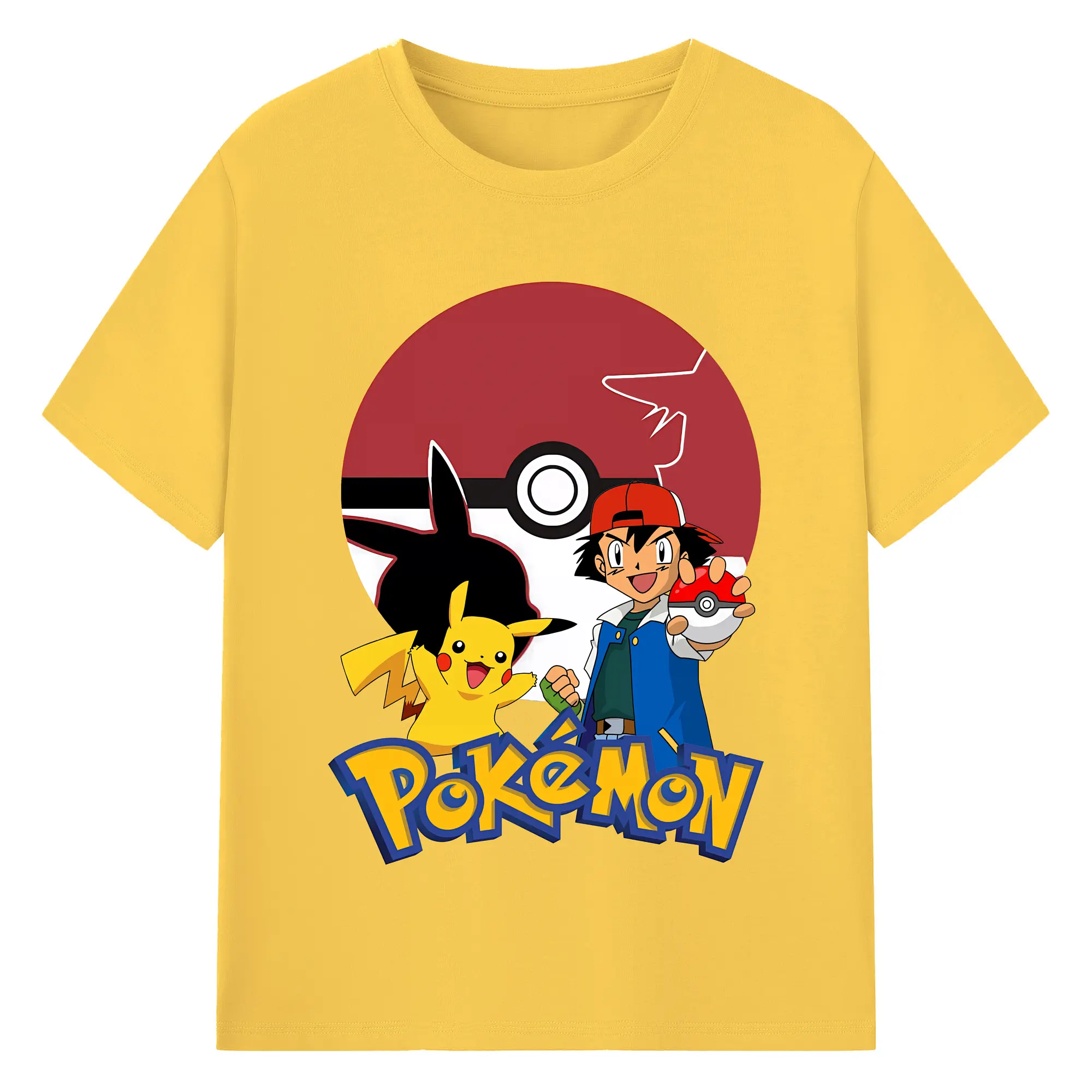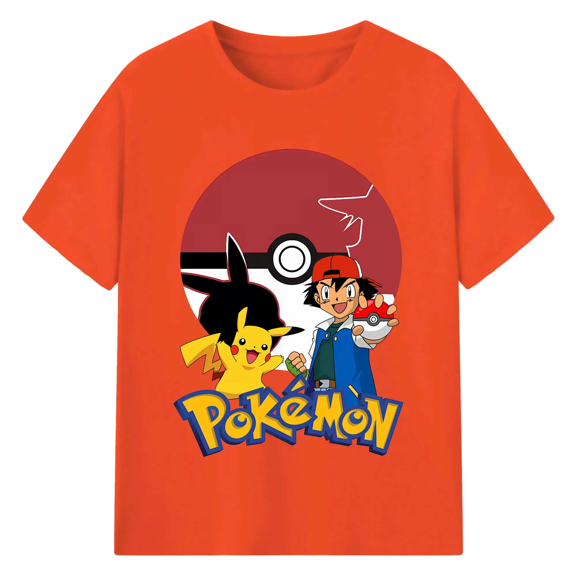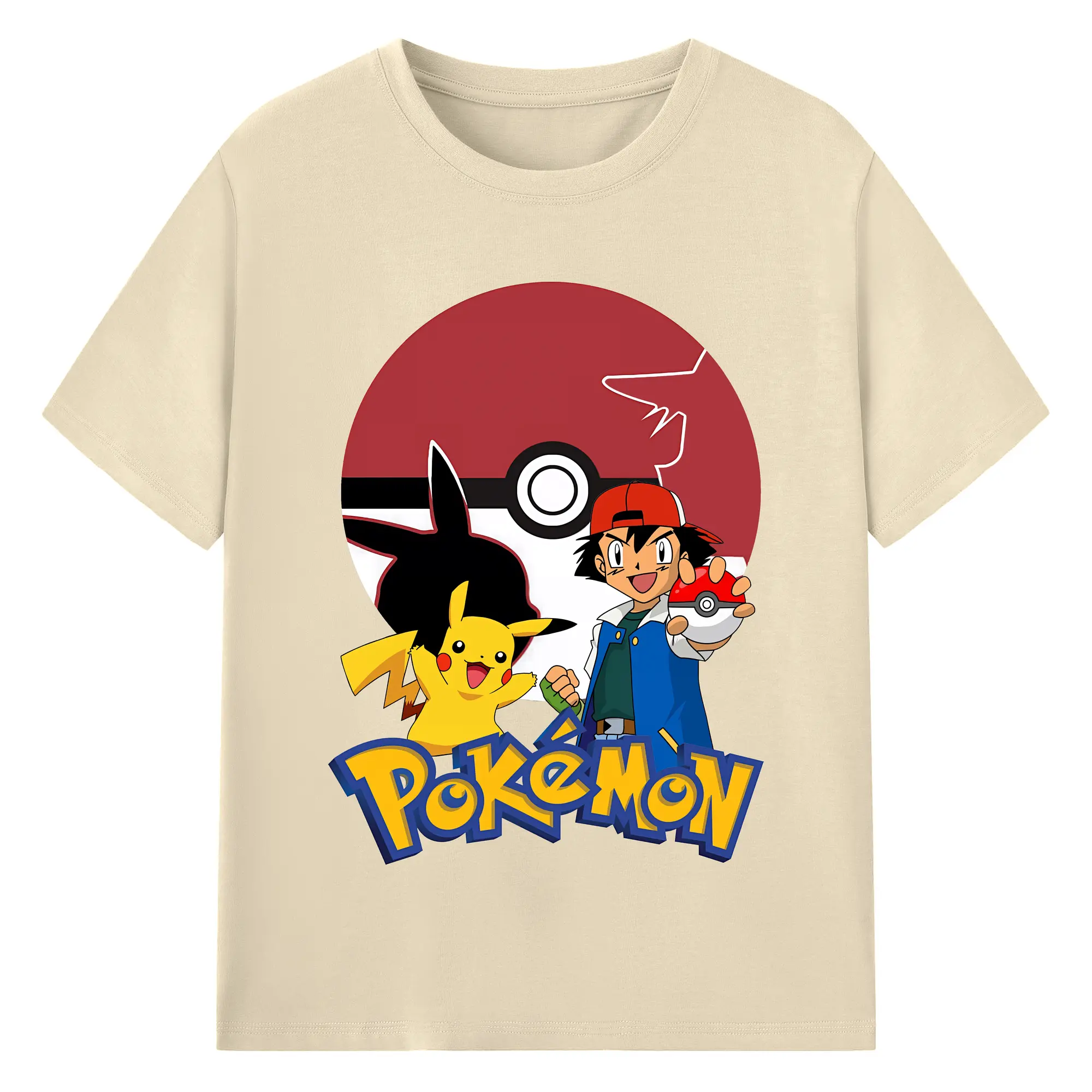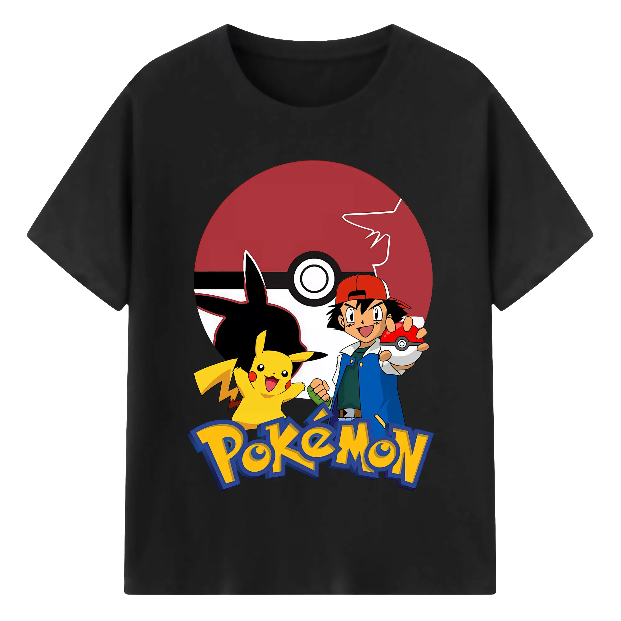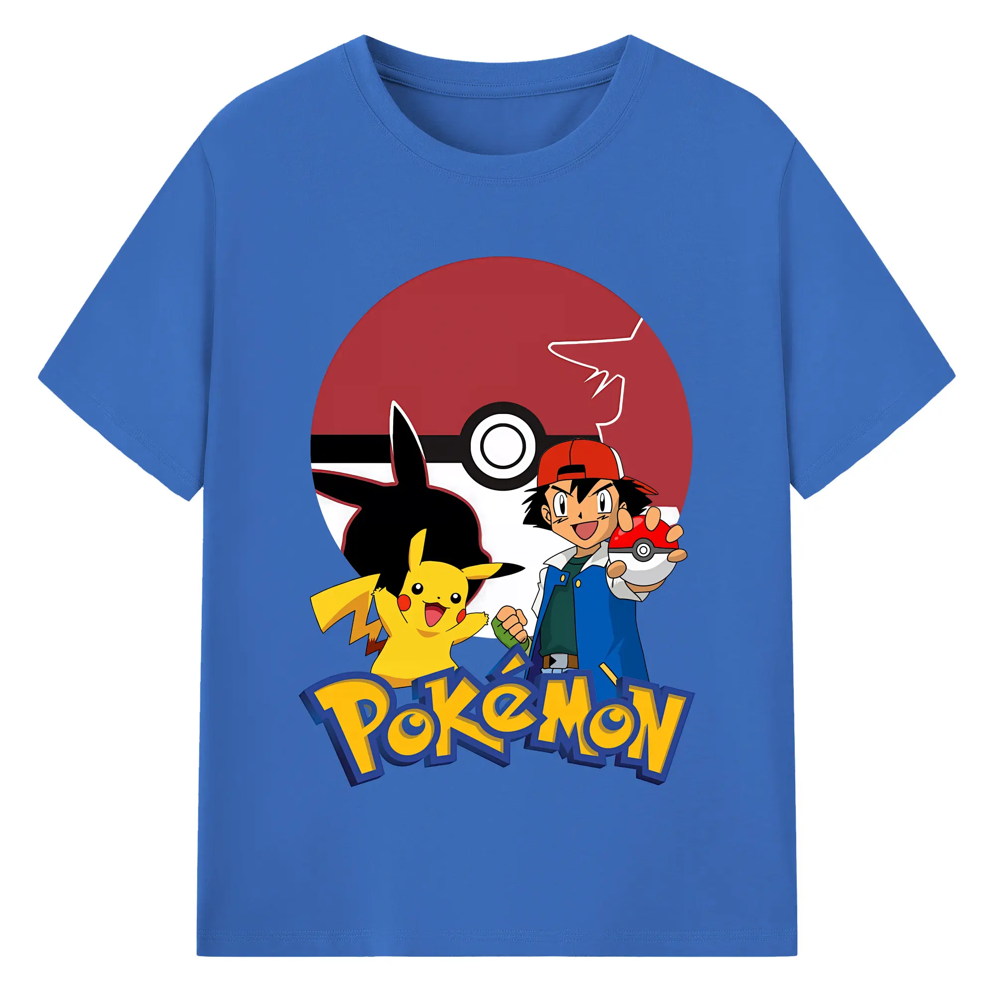 ポケモン ピカチュウ&サトシ 全キャラクター集合 賑やか オリジナルデザイン - 綿100% 半袖Tシャツ ・ フロントプリント ・ 快適 通気性 ・ 日常使い 散歩 スポーツ用