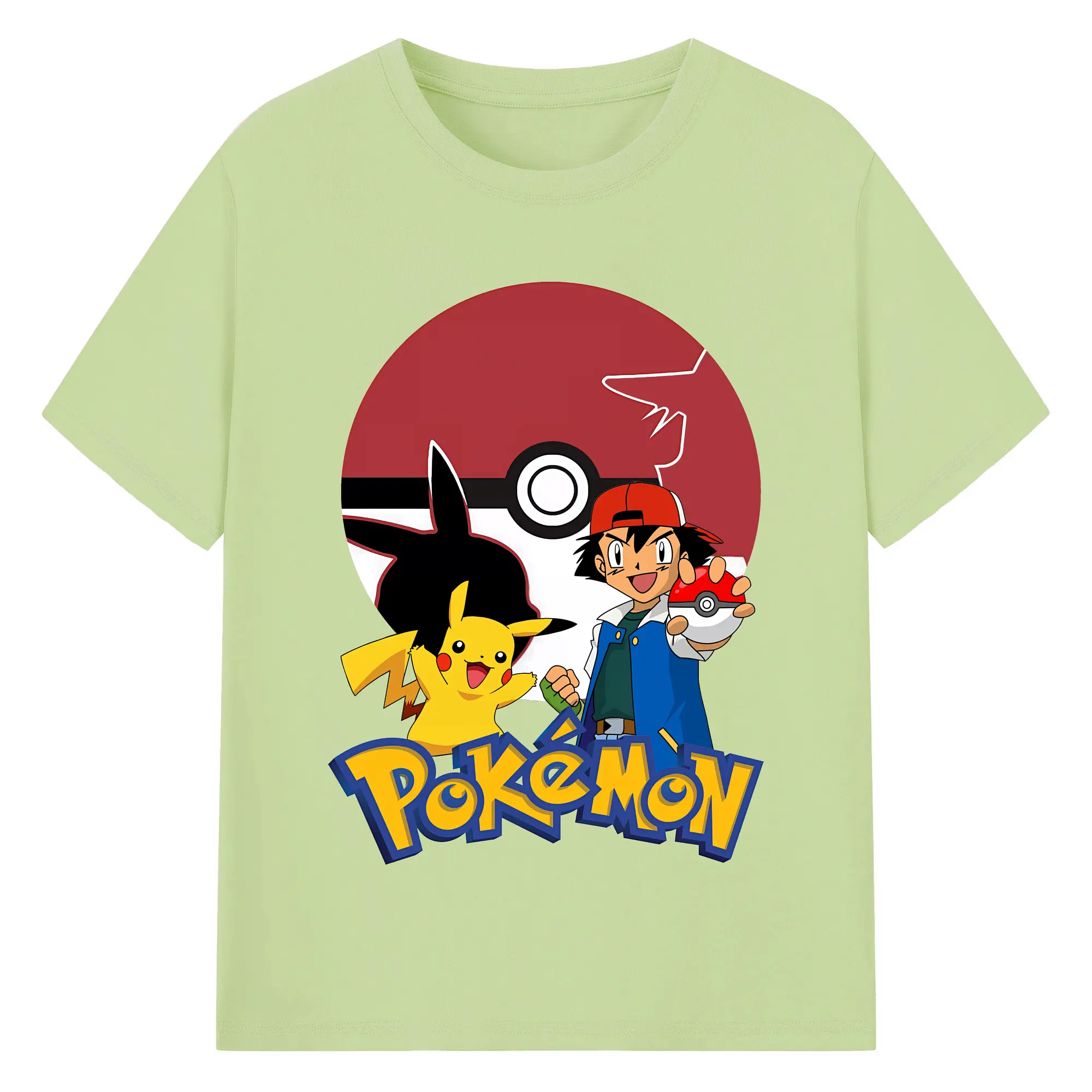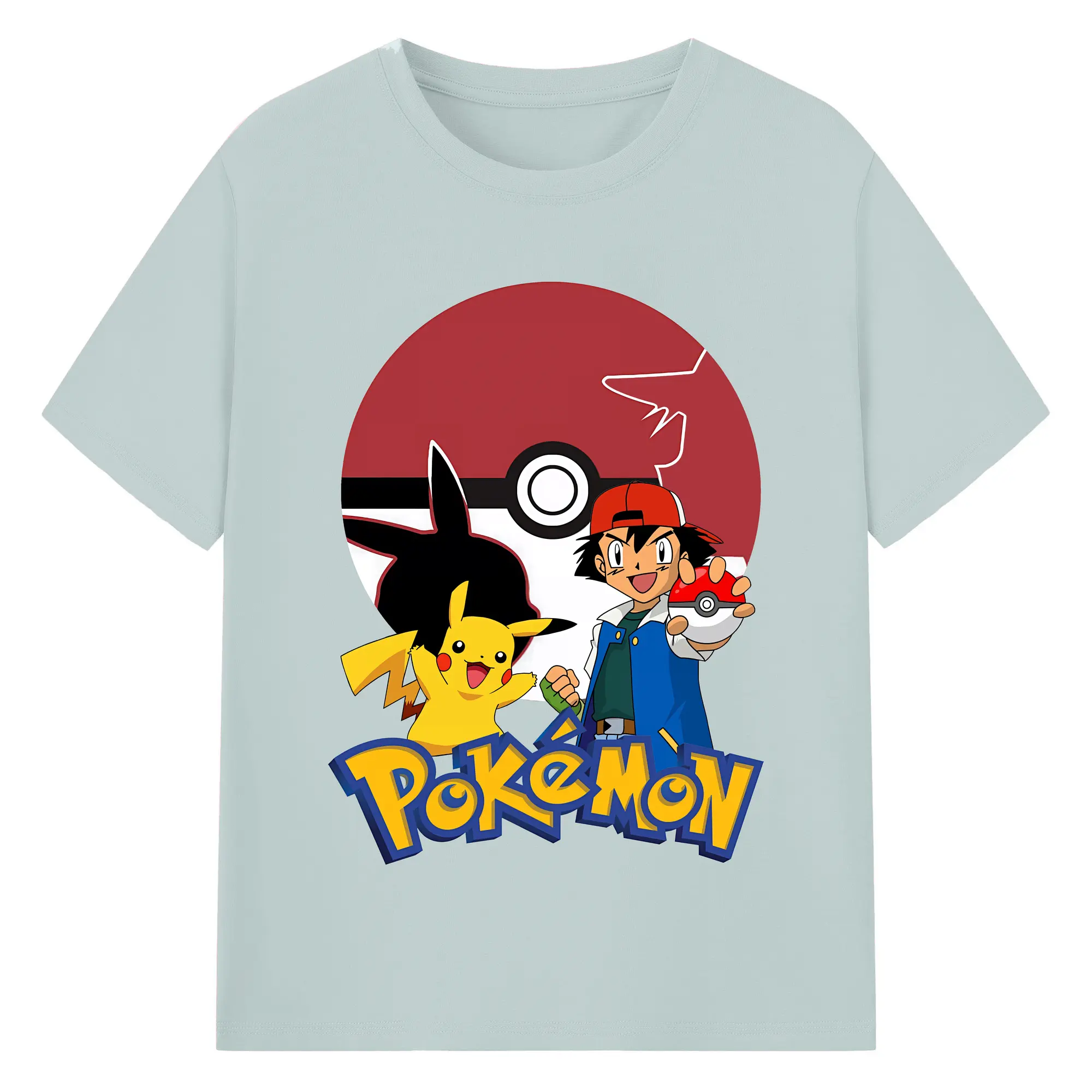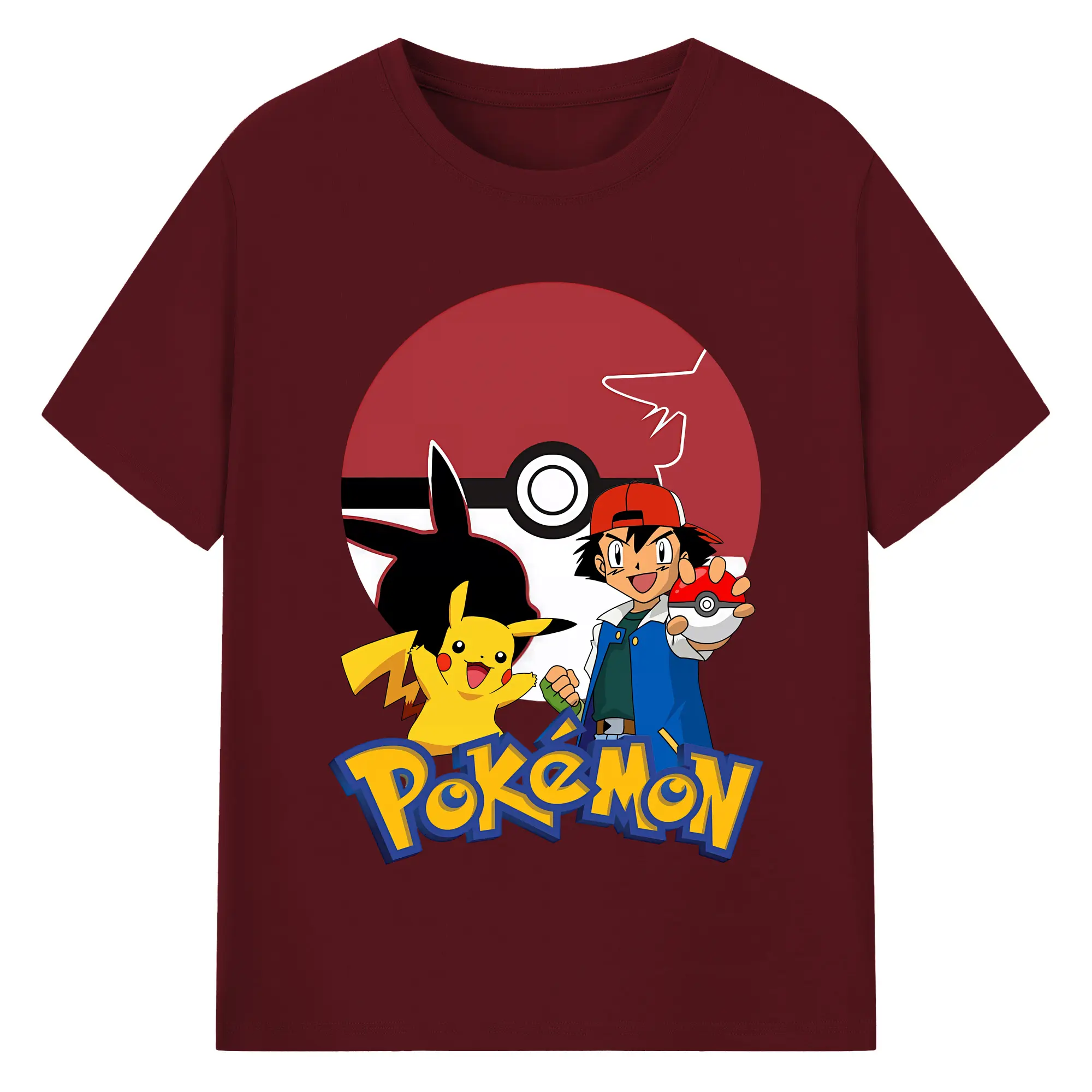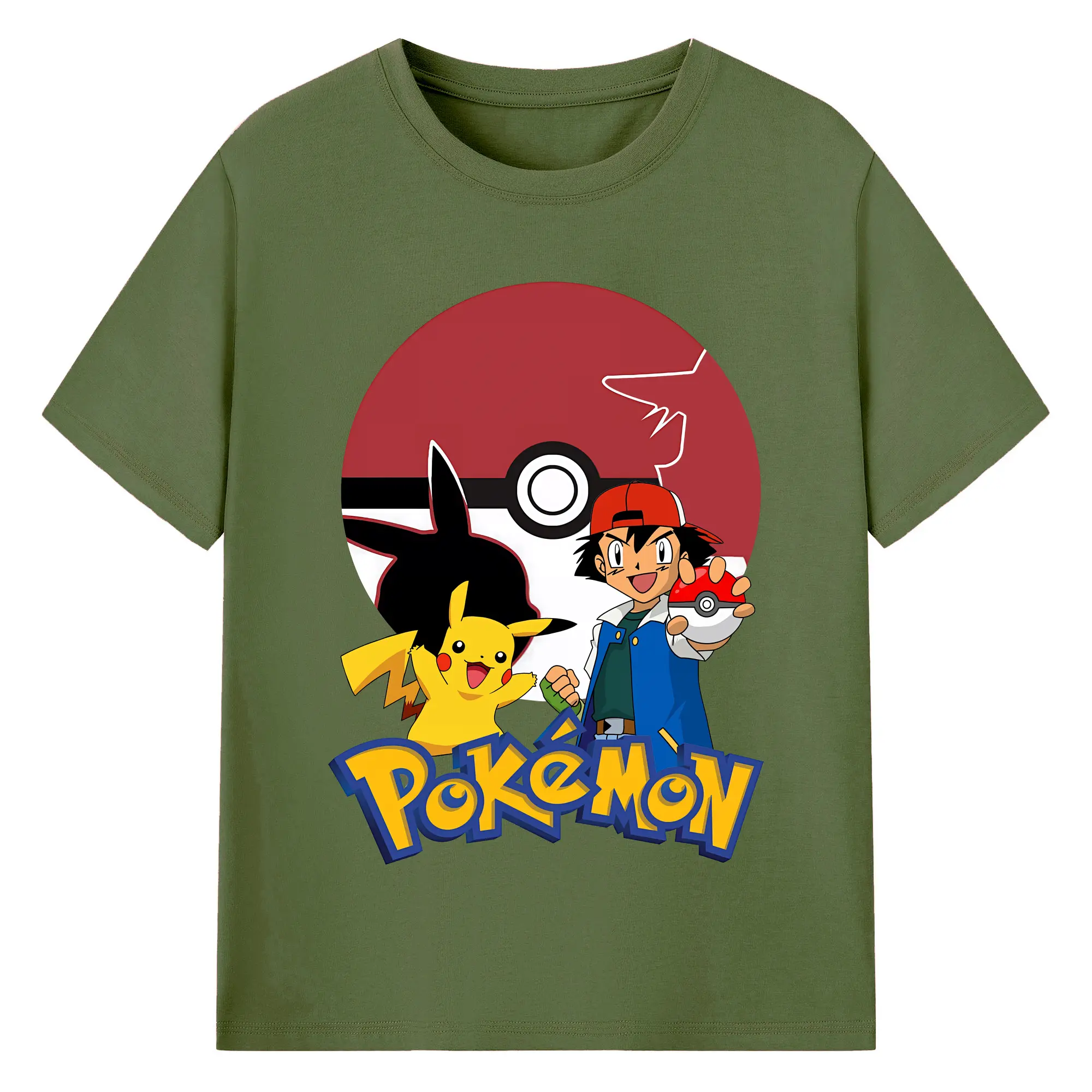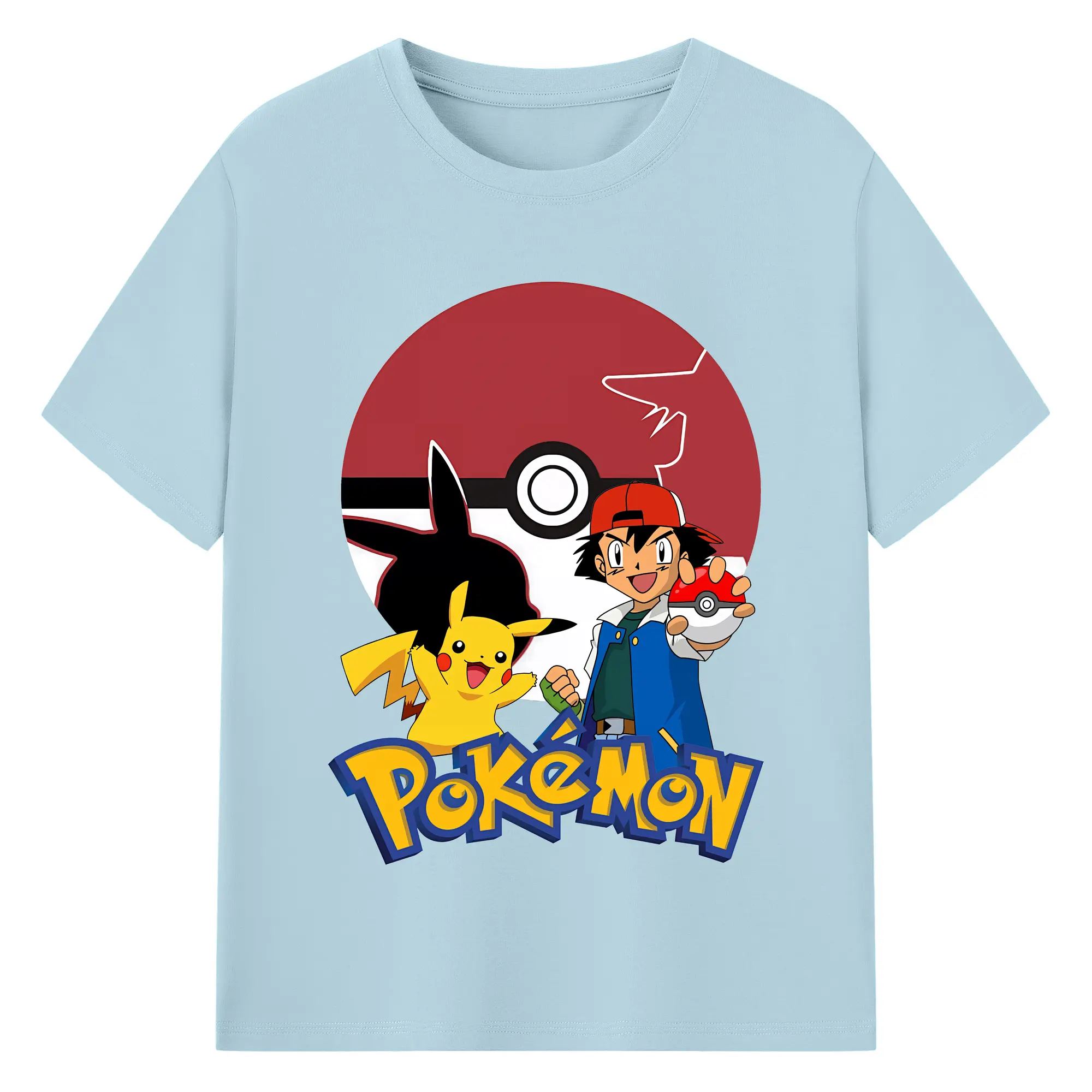 ポケモン ピカチュウ&サトシ 全キャラクター集合 賑やか オリジナルデザイン - 綿100% 半袖Tシャツ ・ フロントプリント ・ 快適 通気性 ・ 日常使い 散歩 スポーツ用
