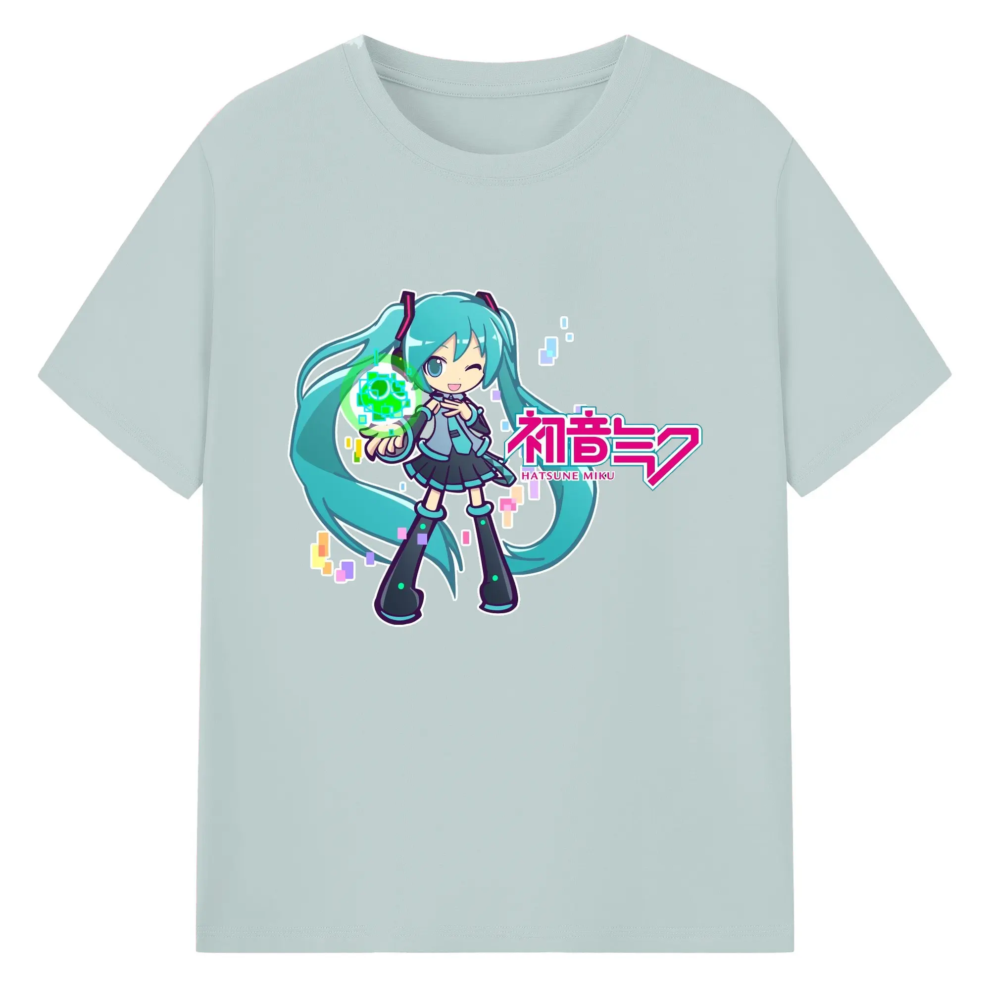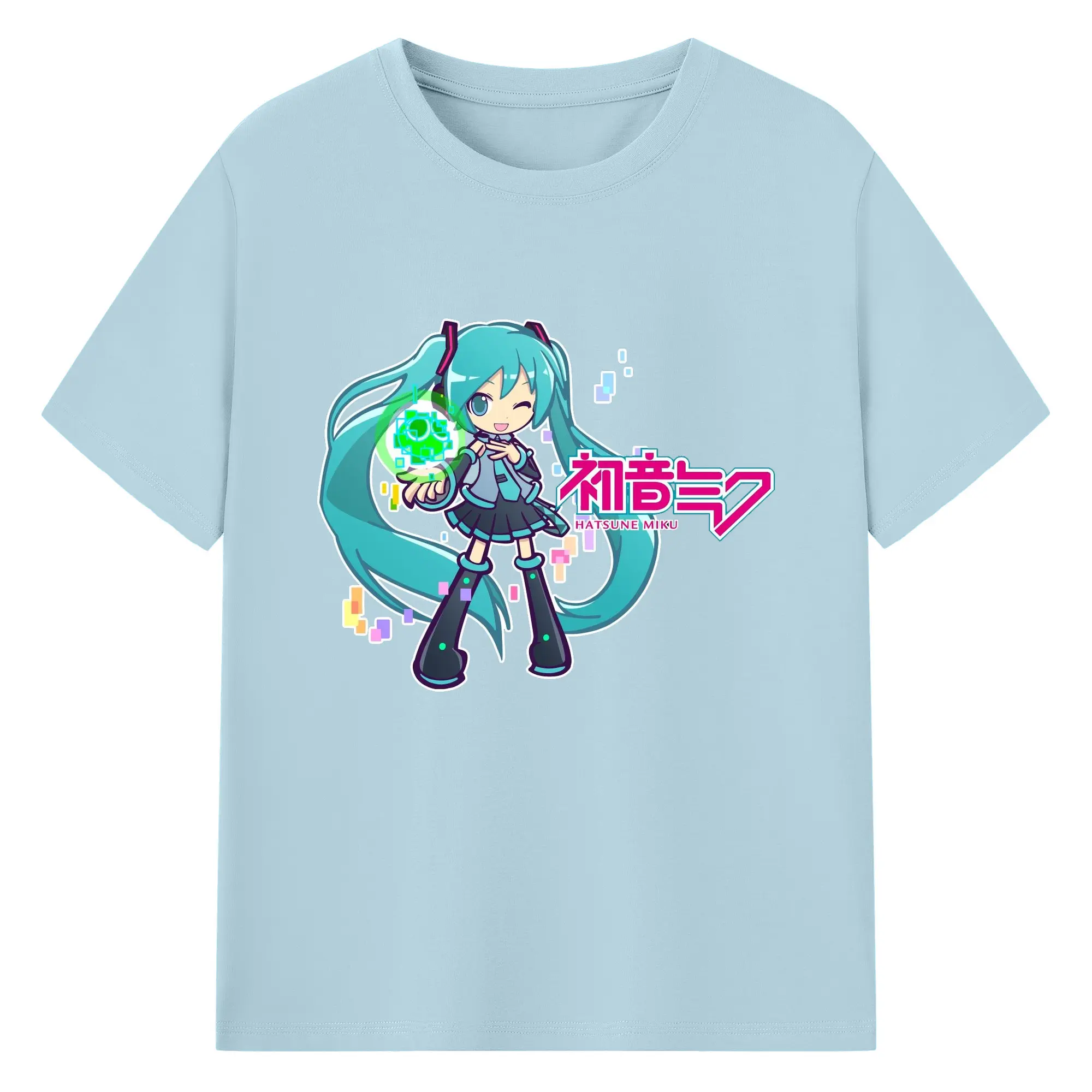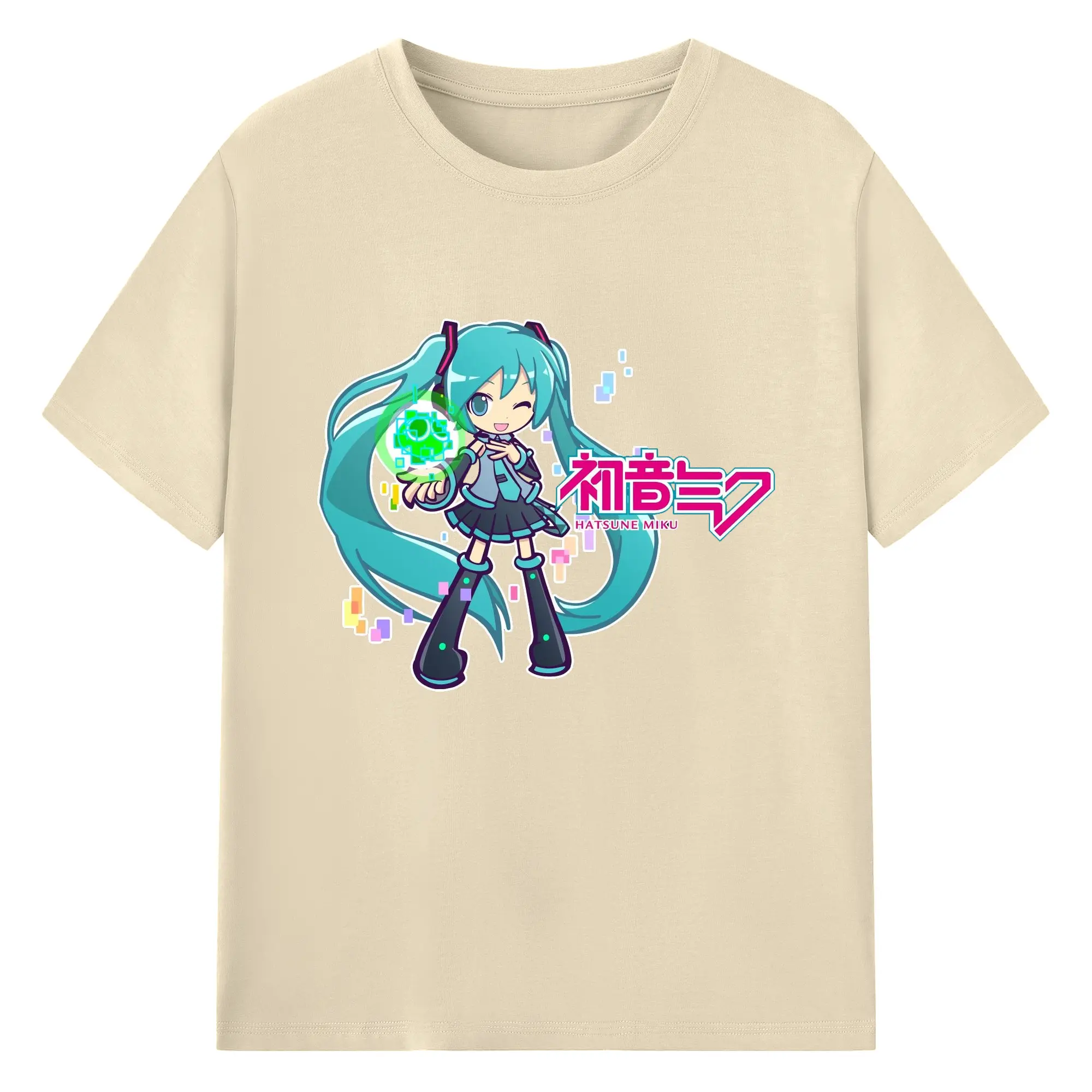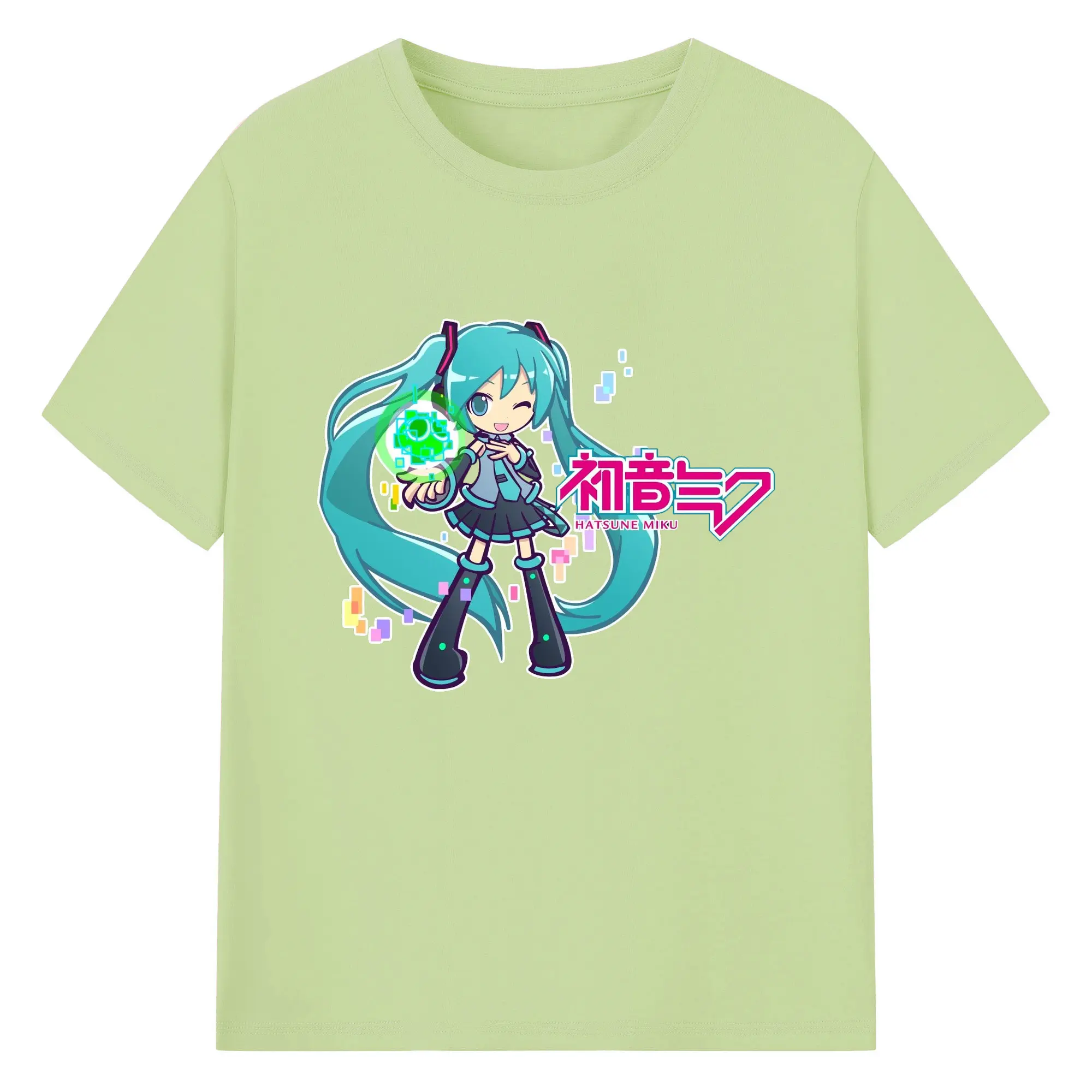 初音ミク&猫コラボ カワイイ文字ロゴ 星と音符アクセントオリジナルデザイン - 綿100% 半袖Tシャツ ・ フロントプリント ・ 快適 通気性 ・ 日常使い 散歩 スポーツ用