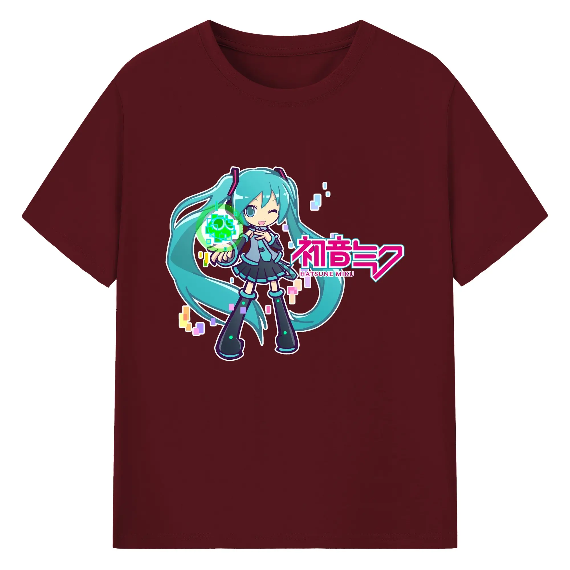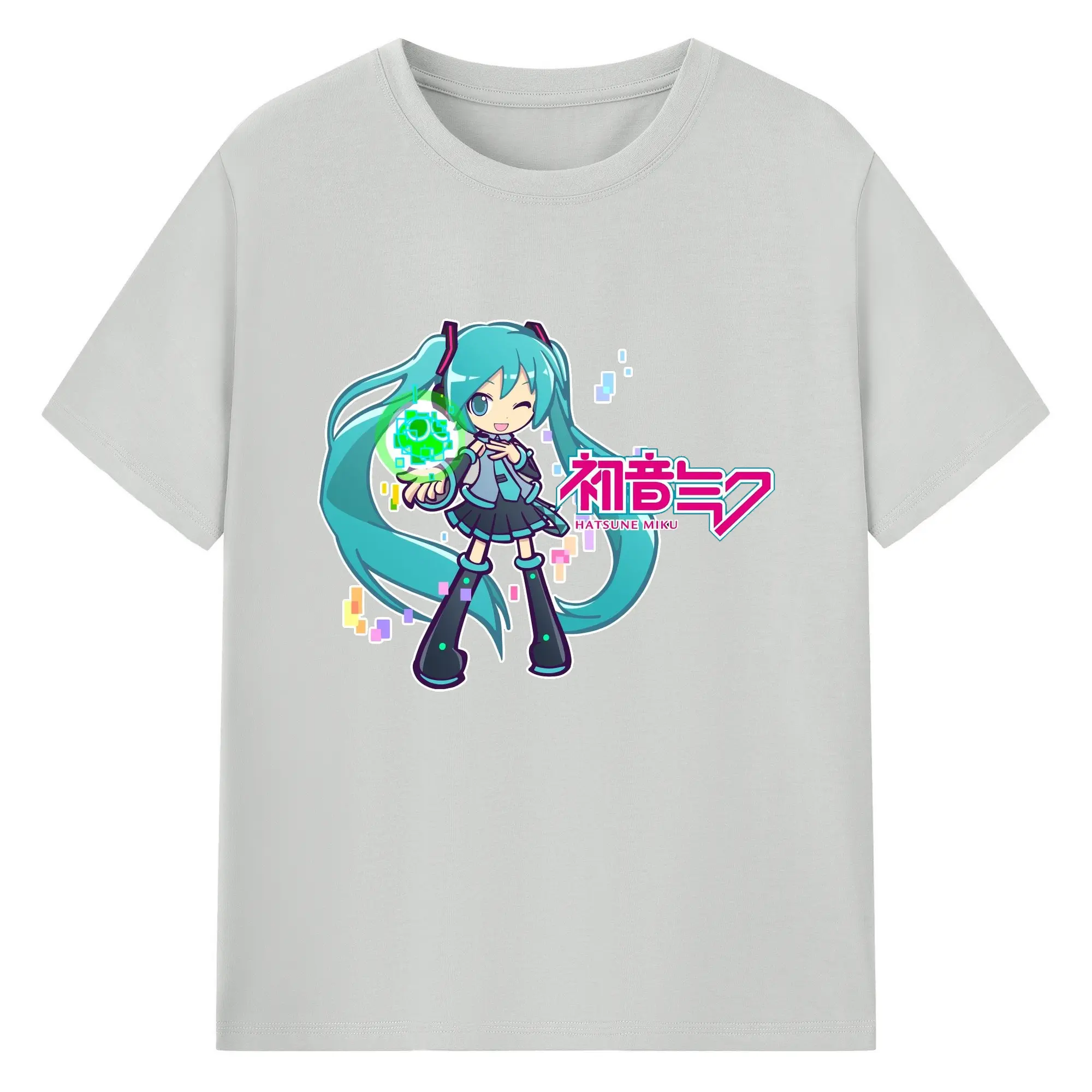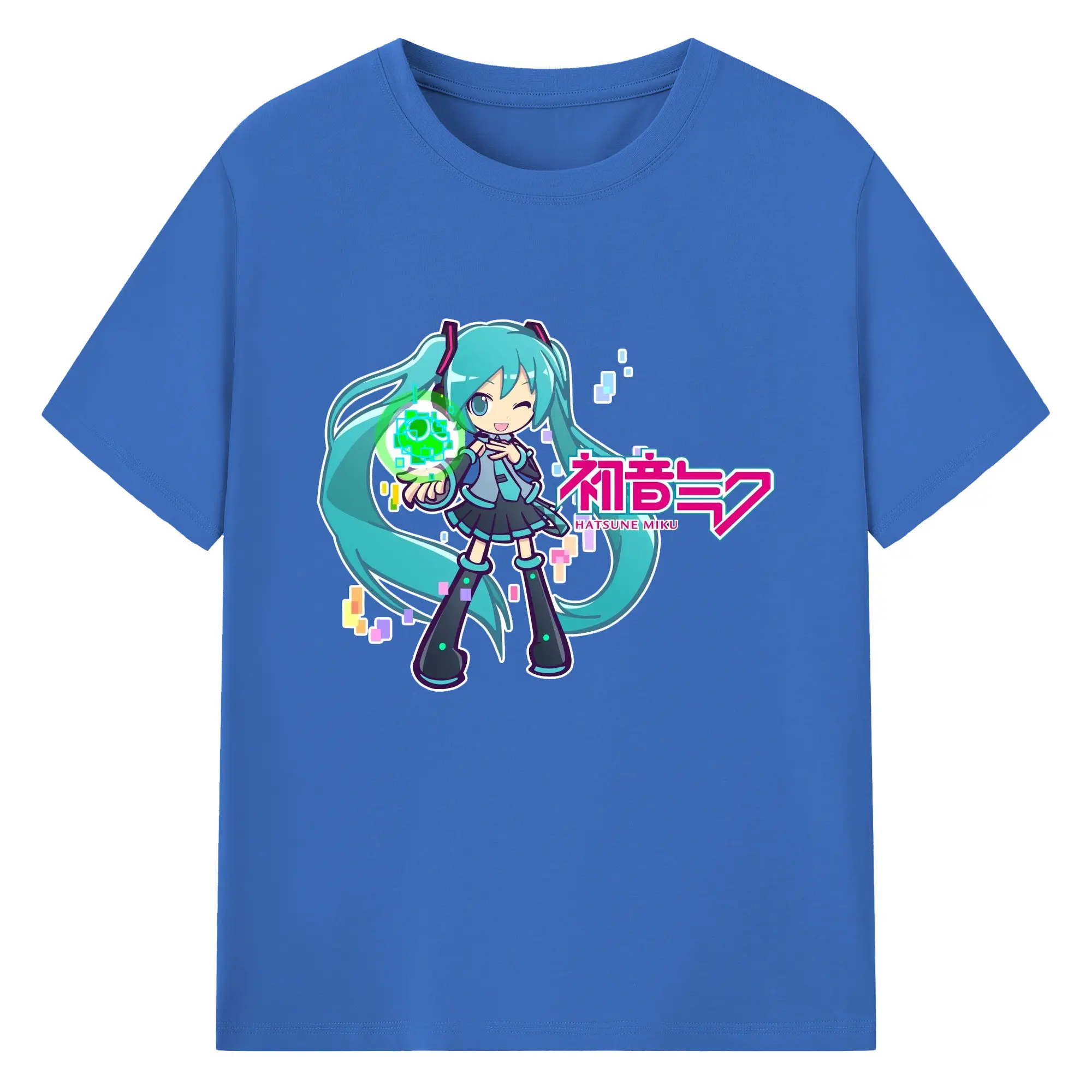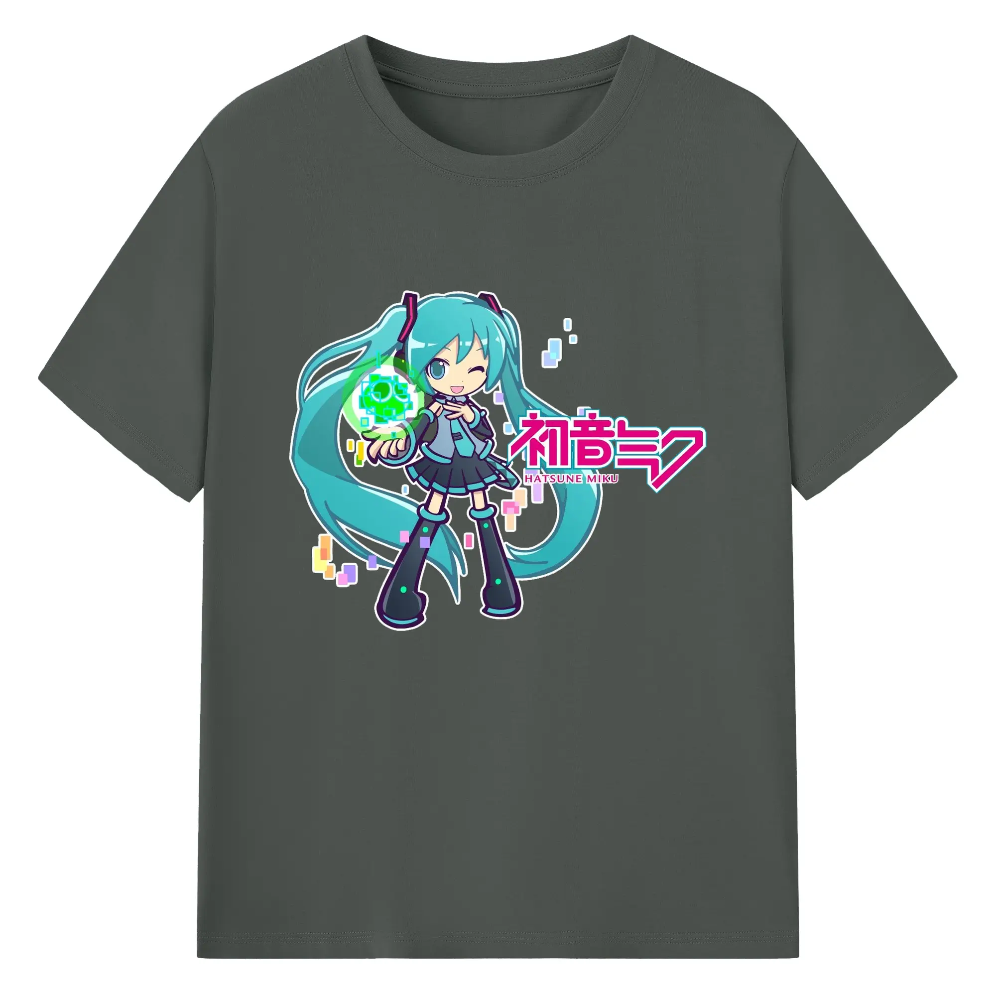 初音ミク&猫コラボ カワイイ文字ロゴ 星と音符アクセントオリジナルデザイン - 綿100% 半袖Tシャツ ・ フロントプリント ・ 快適 通気性 ・ 日常使い 散歩 スポーツ用