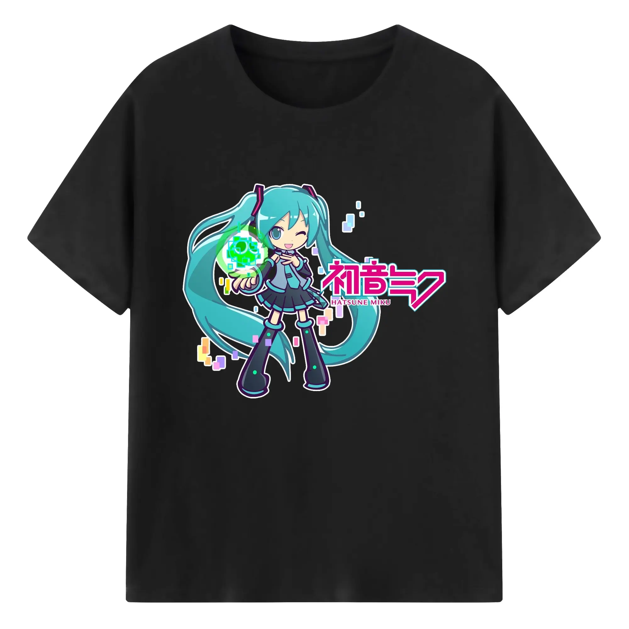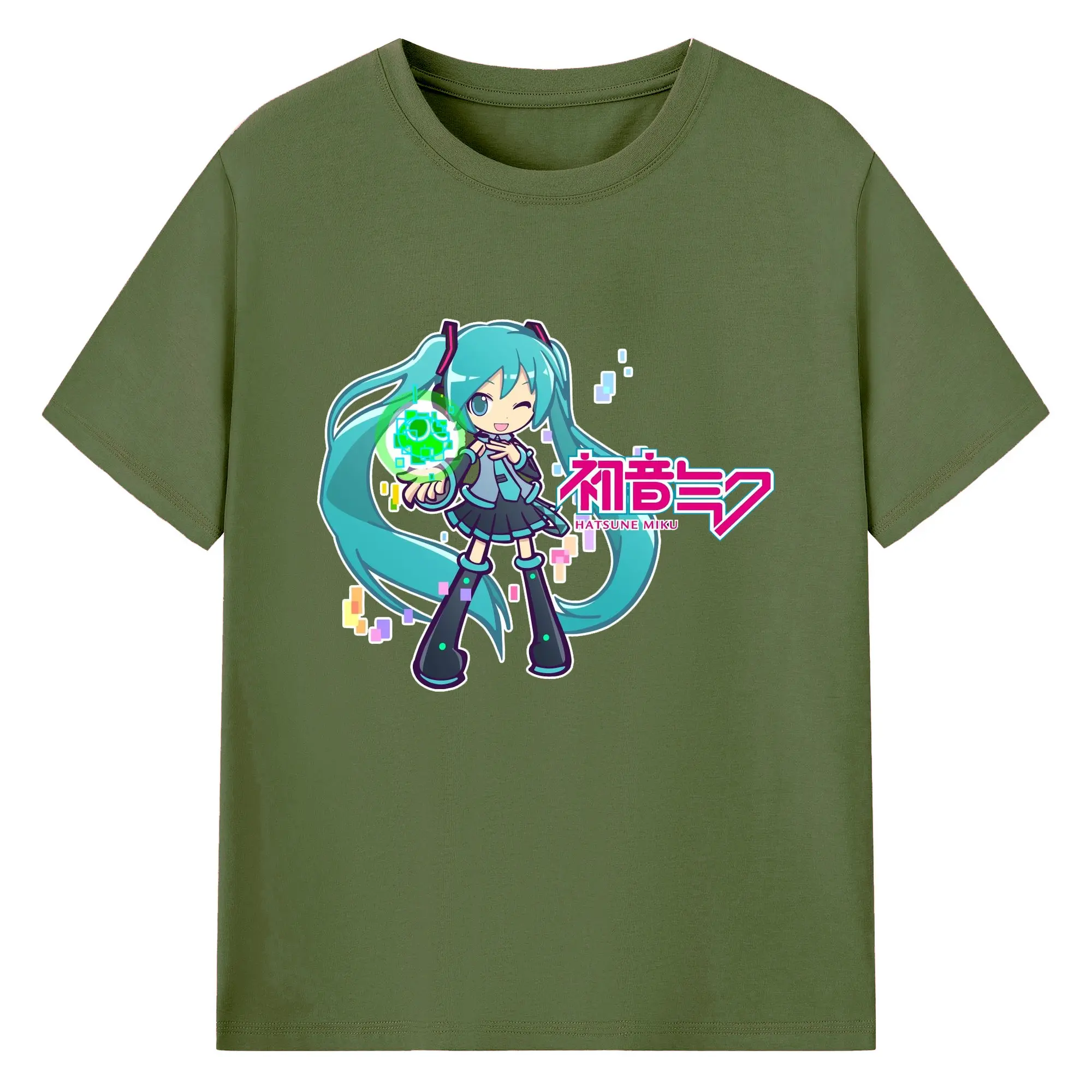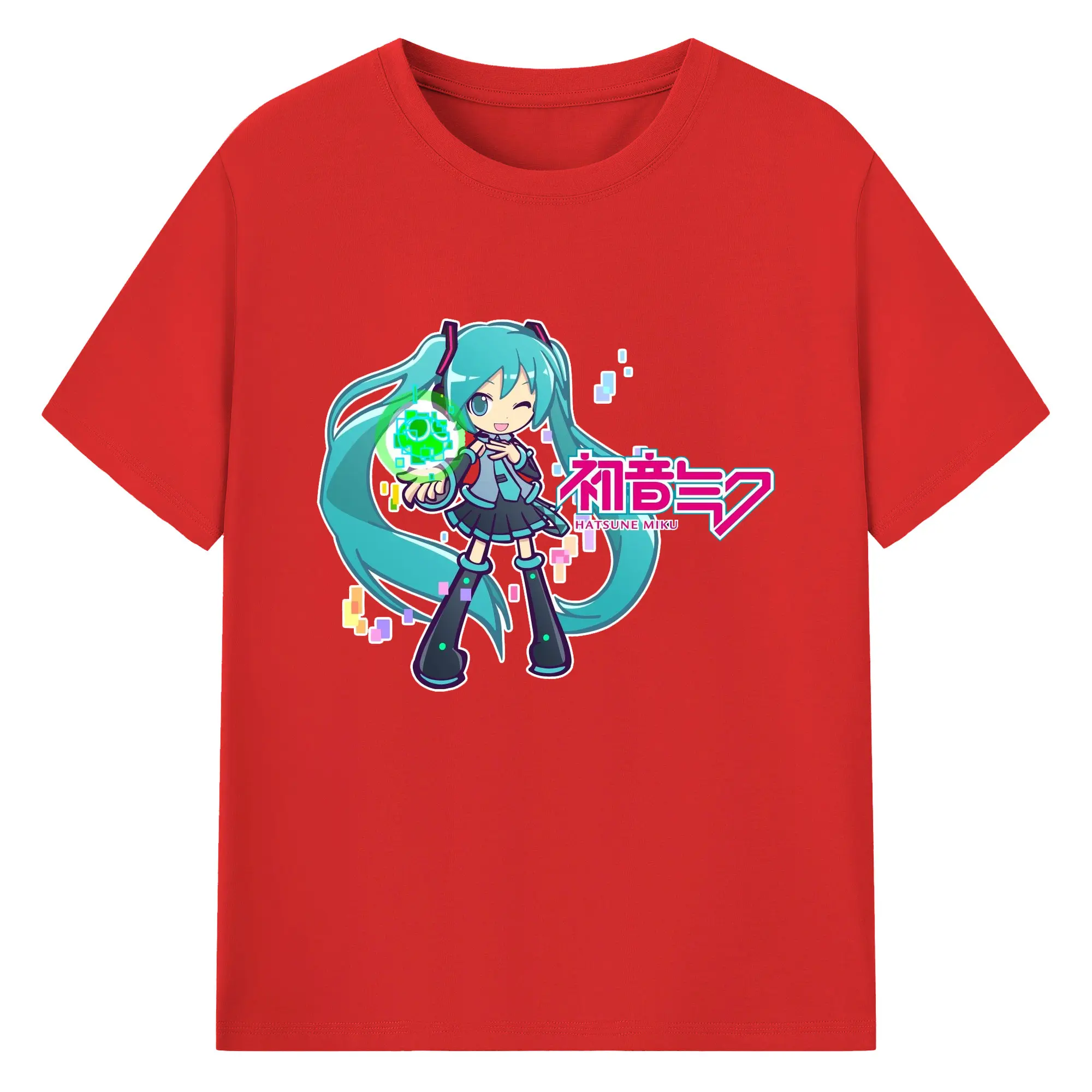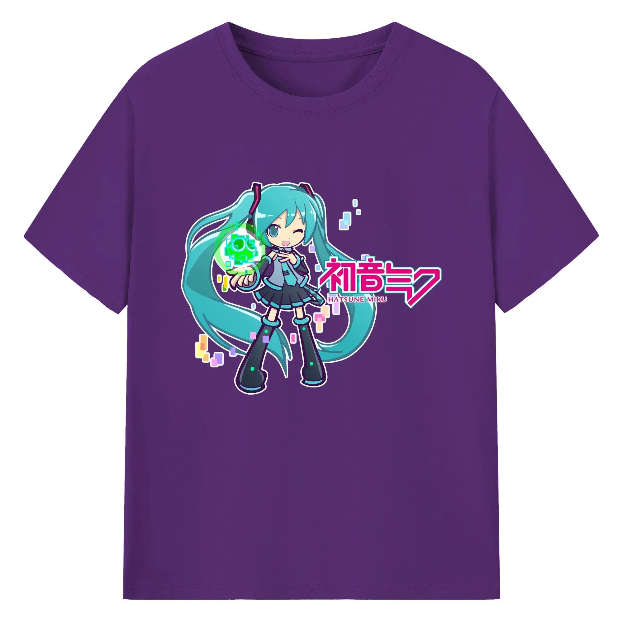 初音ミク&猫コラボ カワイイ文字ロゴ 星と音符アクセントオリジナルデザイン - 綿100% 半袖Tシャツ ・ フロントプリント ・ 快適 通気性 ・ 日常使い 散歩 スポーツ用