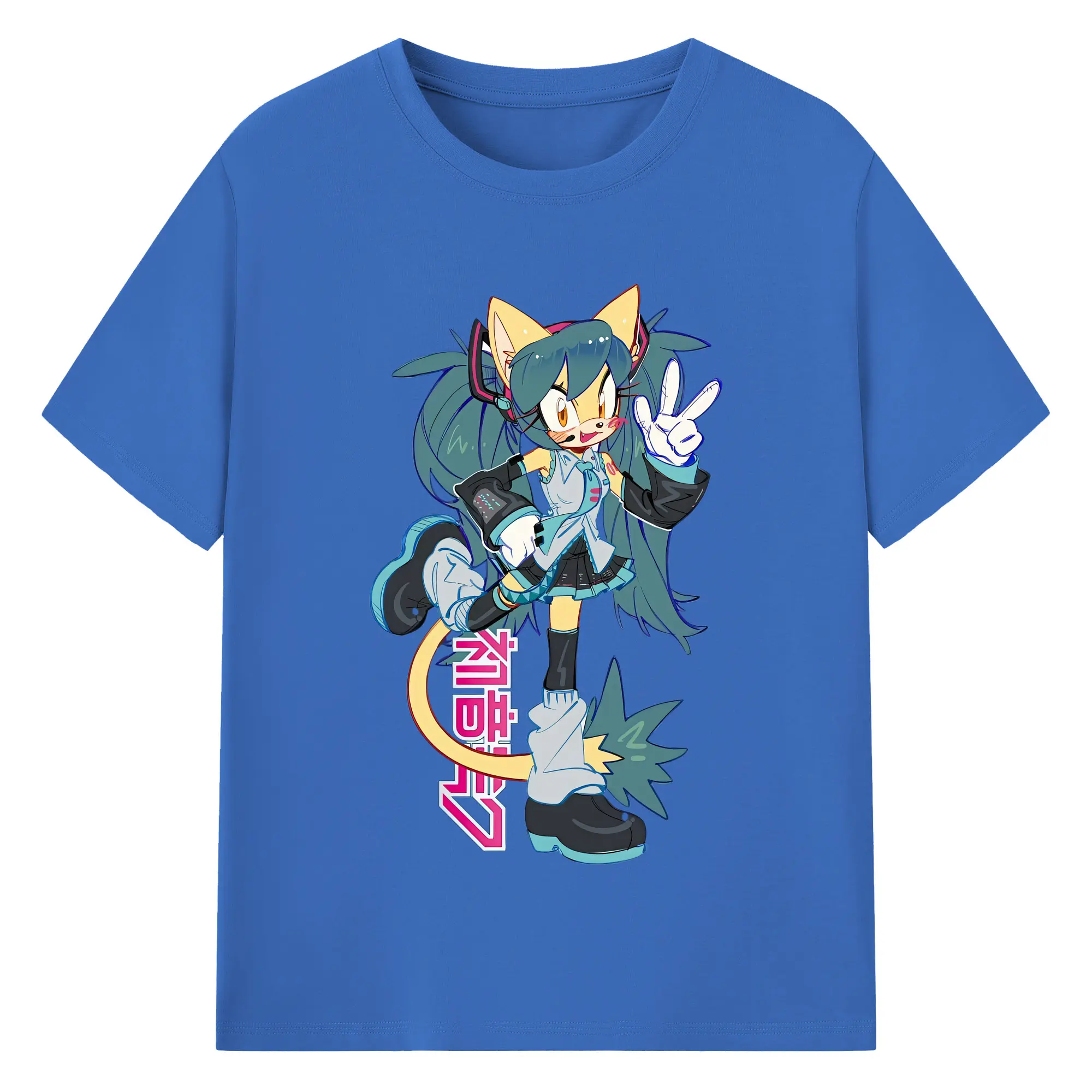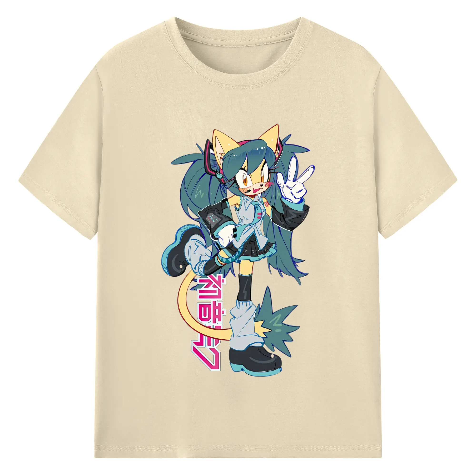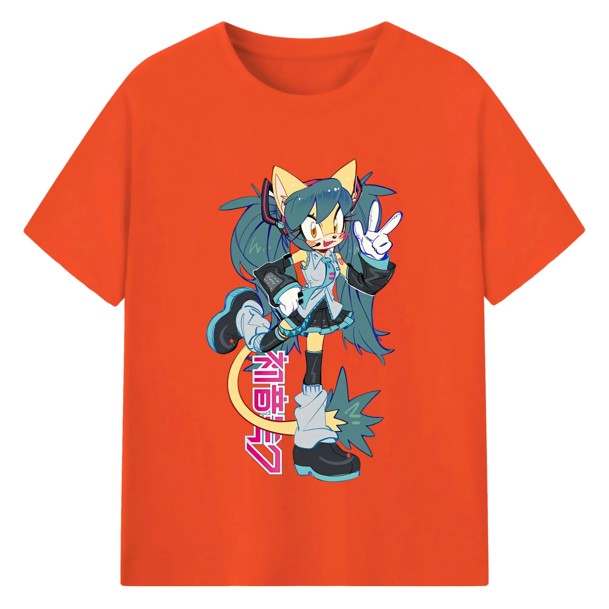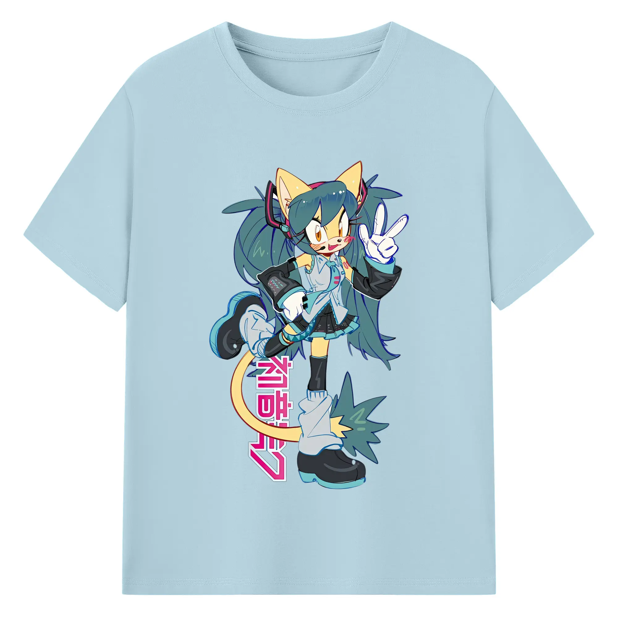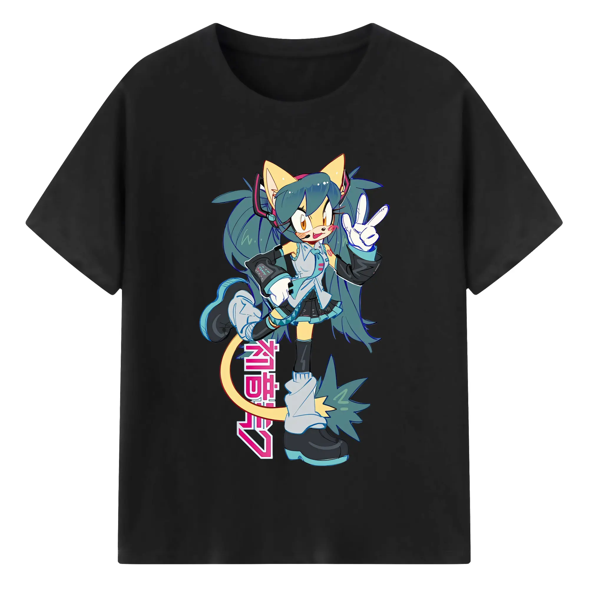 初音ミク&猫 カワイイちびキャラ オリジナルデザイン - 綿100% 半袖Tシャツ ・ フロントプリント ・ 快適 通気性 ・ 日常使い 散歩 スポーツ用