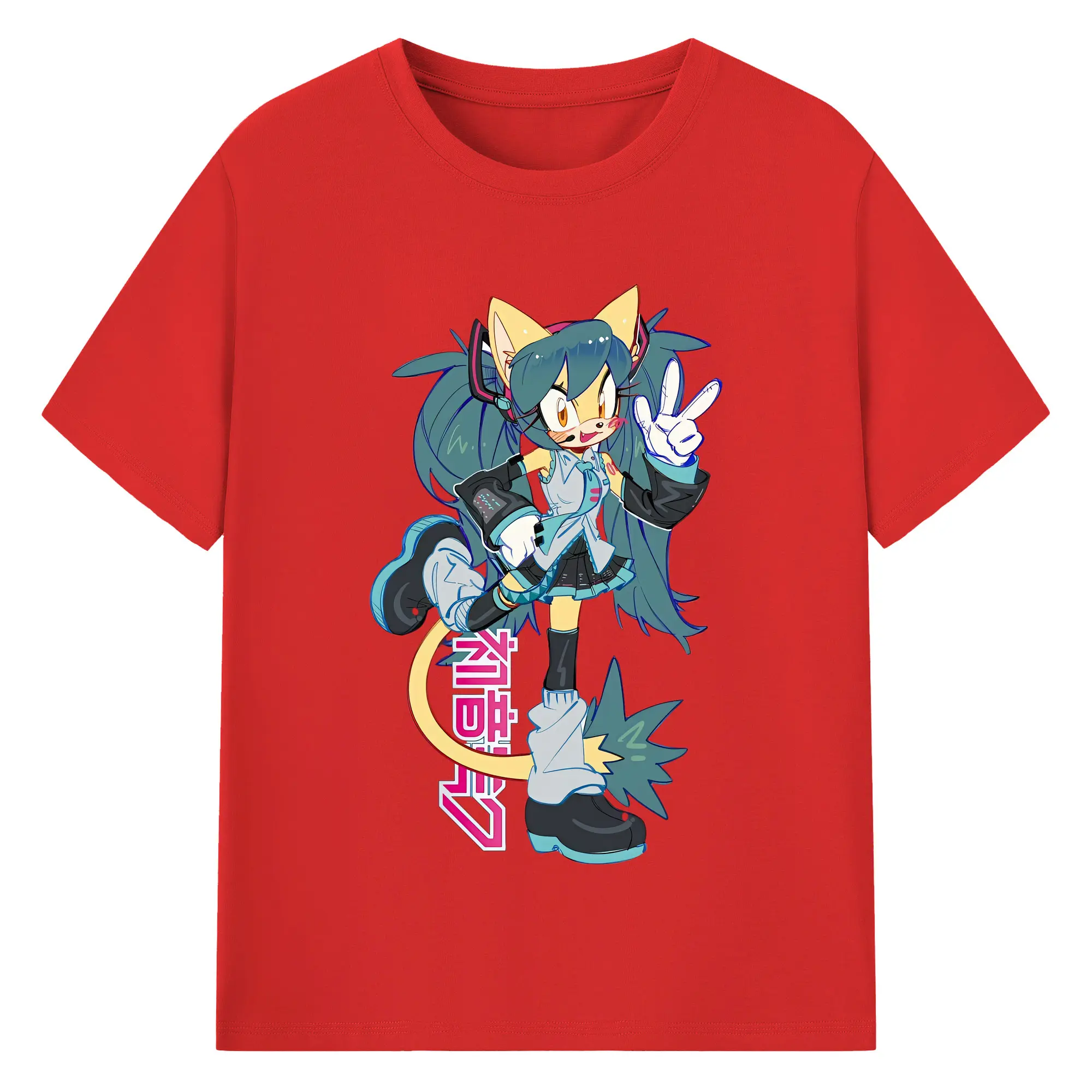 初音ミク 01 赤い光沢デザイン オリジナルデザイン - 綿100% 半袖Tシャツ ・ フロントプリント ・ 快適 通気性 ・ 日常使い 散歩 スポーツ用